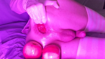 Sissy femboy fisting and gape, 2 juicy apples in my lubed open asshole