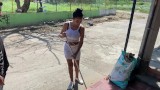 estoy aburrida barriendo afuera de mi casa y mi vecino me invita a follar y acepto